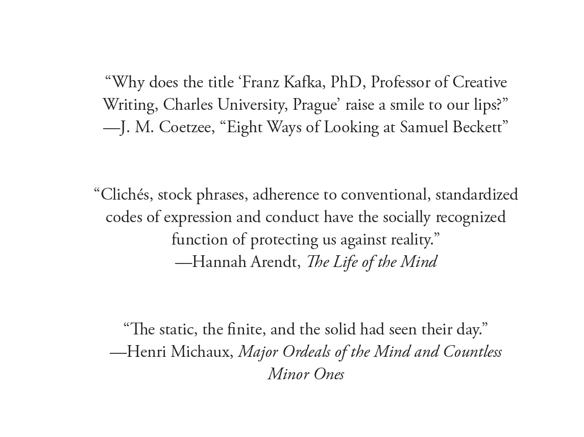 GA: Kafka would take one look at a class of creative writers, and his head would fall into his hands. He would weep convulsively until it turned to laughter, as it must, eventually, one way or another, quickly and infectiously becoming hysterical. The orgasm of the laugh. He would shout "Coming-of-age tales set in plausible fairylands?" He would then walk out, with pity but without a word, and write "In the Penal Colony II: Marketing the Skin of the Dead Artist."